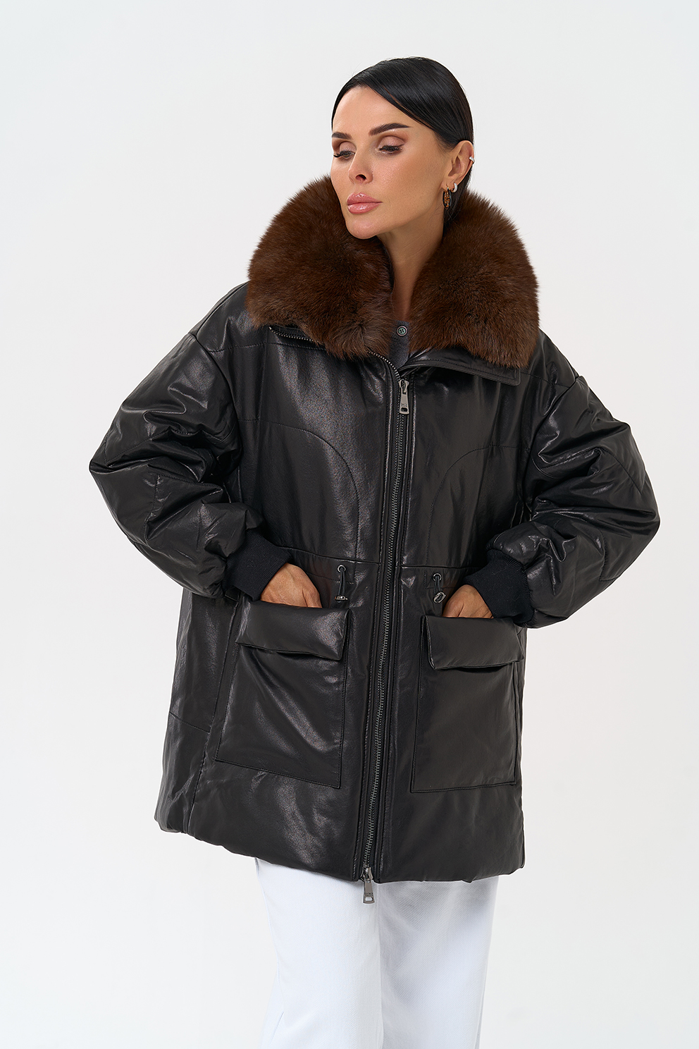 Утепленная кожаная куртка с песцом