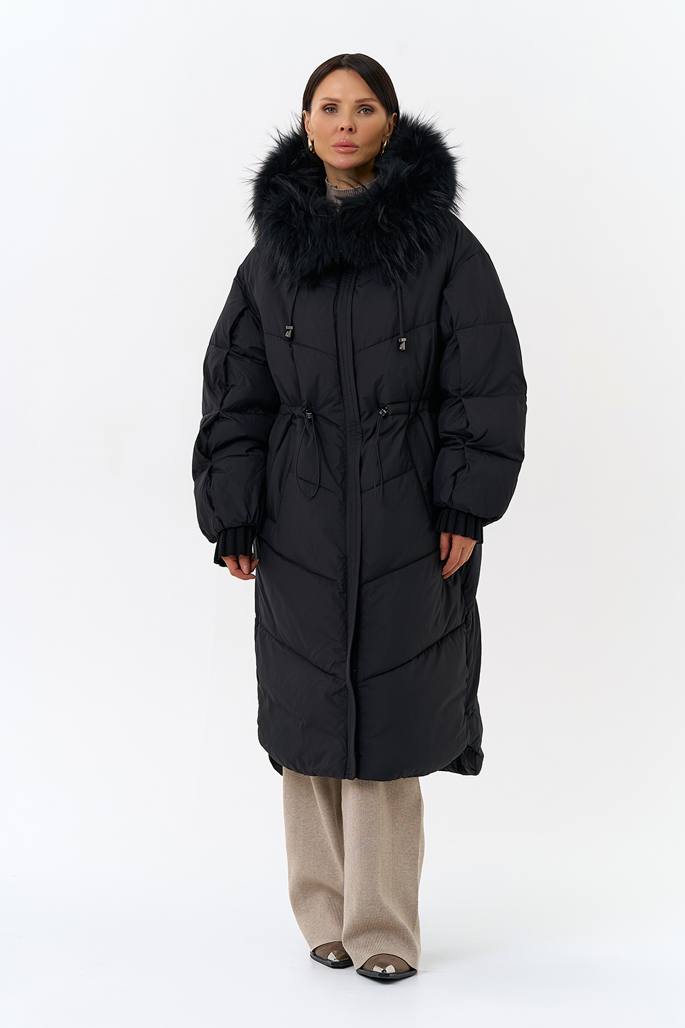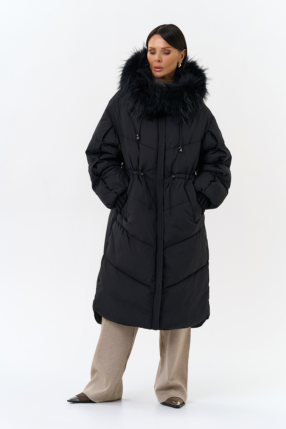 Крой воротника - капюшон, отделка чернобурка